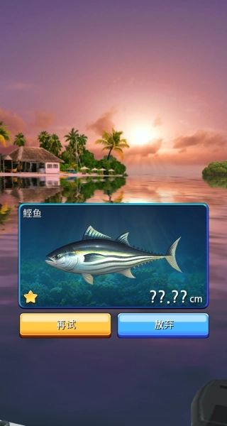 4、鱼儿被钓上岸后,界面会显示出鱼种(例如鲣鱼)以及尺寸信息,此时可选择“再试”继续进行钓鱼操作,也可以点击“放弃”来结束本次钓鱼流程。