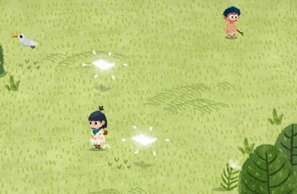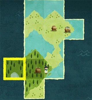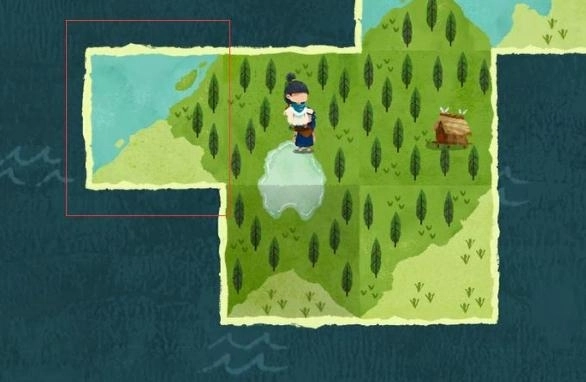 完成教学环节后,卡朵可以在一位渔夫身旁捡到泛着白光的碎片,把它和已有的地图拼合到一起,就能生成新的地图,此时卡朵会发现房屋出现在自己周围。