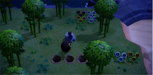 3、杂草清理完毕后,我们需要在敲击石头的位置后方挖三个大坑,由于敲击石头时会产生后坐力,这样做能避免因后坐力影响而长时间无法获取矿石。