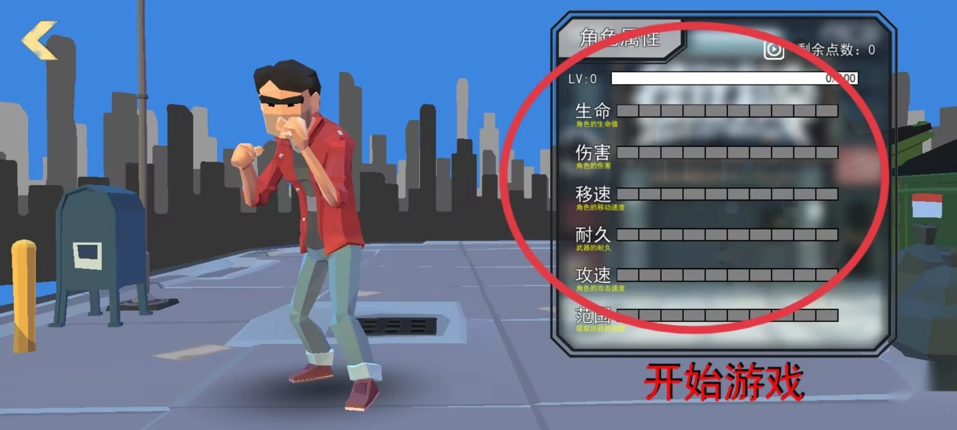 选定角色后点击开始按钮进入战斗,右侧面板会同步呈现该角色的基础属性数值,其中涵盖攻击强度与生命值等关键参数。
