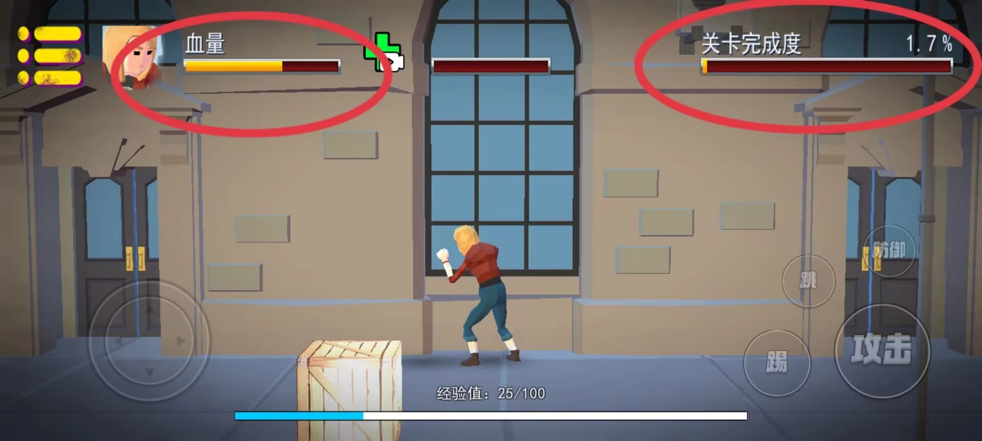 2、敌方单位出现时会同步显示其生命值,右侧设有防御、普攻与跳跃三个战斗指令按键。攻击、踢击和跳跃图标。