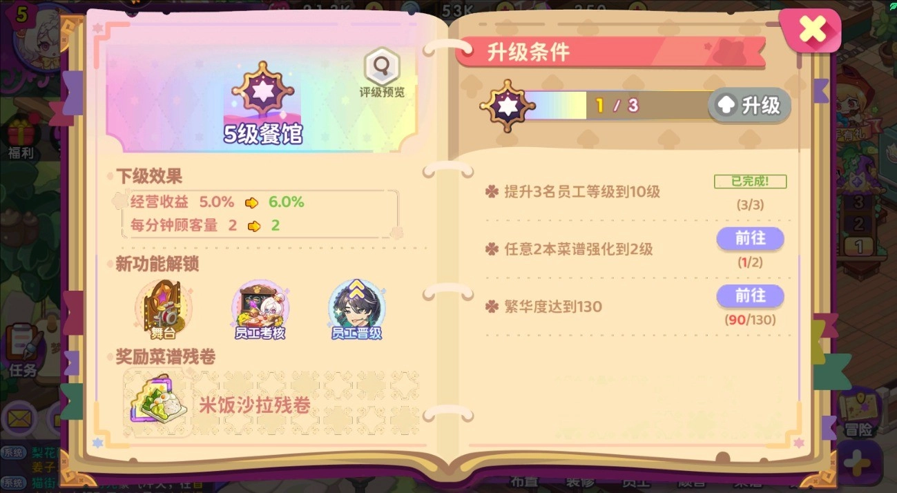 方法二:主线任务完成后,只需达成特定条件即可实现提升,系统设有专门的提升条件需玩家完成,待所有条件达成后,店铺规模、烹饪玩法等内容都会相应增加。