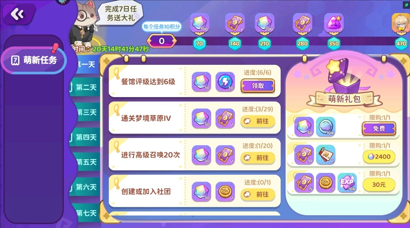 3、在萌新福利界面(见下图),完成指定的萌新任务同样能获取钻石。