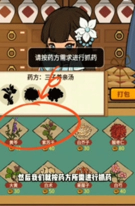 3、点击开药方,就能看到病人需要的药,根据黑影很容易找出需要的药材