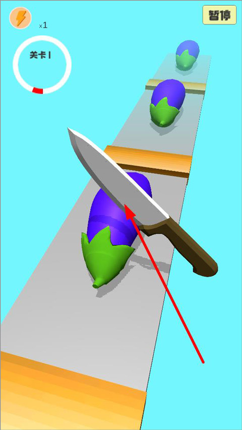 3、操控案板上的刀来切蔬菜,屏幕左上方设有关卡进度提示,玩家可依据该提示进行游戏。