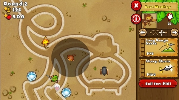 分别建造迫击炮猴、机枪猴,然后再升级图钉塔和飞镖猴,增强基础火力。