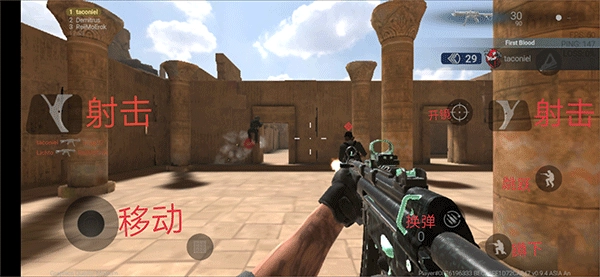 2、匹配成功后会直接进入战斗环节,左侧的虚拟摇杆用来操控角色移动,右侧的按钮则可进行射击、换弹、蹲伏、跳跃等各类操作;