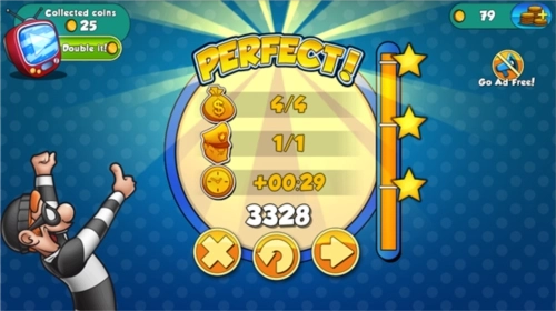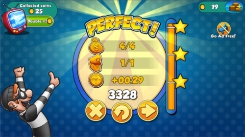 3.在每一关当中都有相应的任务要求,任务分为三种:收集场景中的养老金,躲过人们的视线,在规定的时间内完成任务并全身而退,在游戏结束后将根据玩家在三个任务中的表现给予相应的评价。前两个任务要想完成还是比较简单的,时间方面只要玩家动作够快也不是什么难事。随着游戏的进行游戏中出现的元素越来越多,甚至出现了一些机关需要玩家解决才能顺利通过,这时候就要考验玩家的技术了,不过玩家可以通过使用道具帮助自己过关,每一种道具都有其功能,怎么使用就看玩家的智商了。