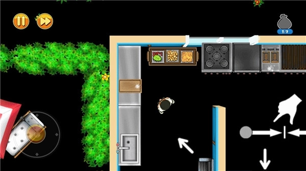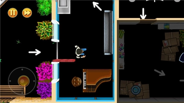 2.游戏开始之后玩家通过操纵画面左侧的虚拟摇杆即可控制鲍勃移动,当鲍勃来到门前的时候他会自己推开门,不过有一些们则需要鲍勃用更大的力量撞开,此时玩家就需要点击右侧的跑步按键了,跑步将会使得他的移动变的更加快速,在被对方追赶或者需要快速通过某个地点的时候就变得尤为重要了,不过坏处就是在跑步的过程中会发出比较大的声音,容易被人所发现,所以一定要在恰当的时机使用。
