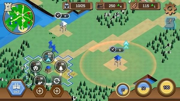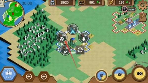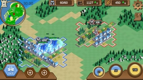 你能够建造伐木场、农田和兵营,从而获取木材、粮食与士兵数量。其中,木材用于建筑的建造和升级,粮食是产出士兵的必要资源,兵营则承担着训练士兵的功能。因此,玩家需要在这三种建筑以及对应的资源之间进行权衡考量,进而制定出最优化的策略方案。