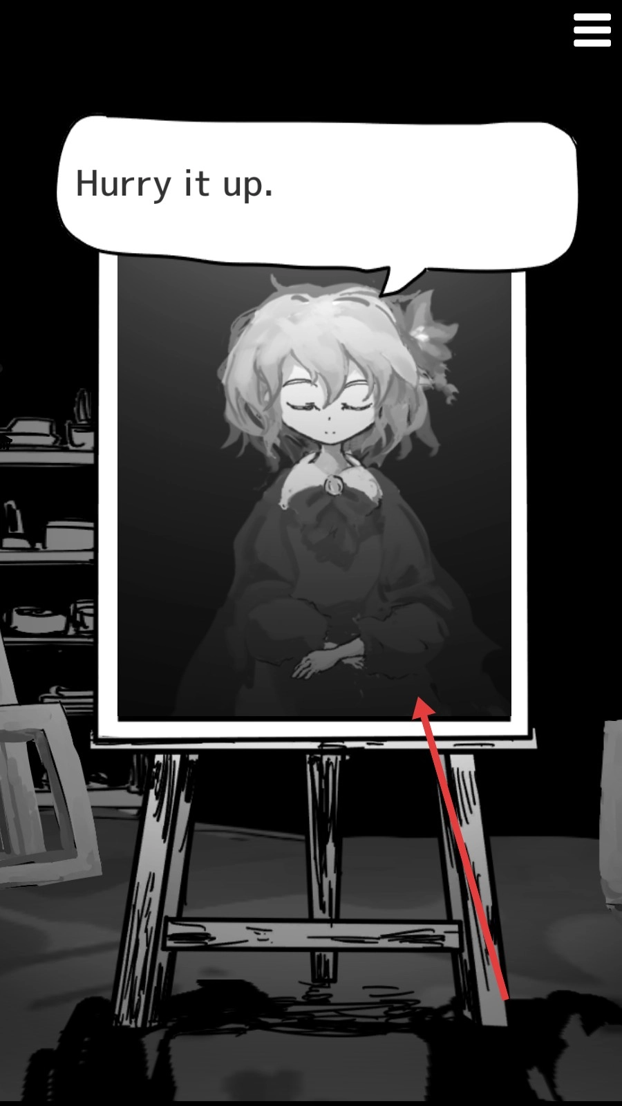4、当看到画中的少女以及【Hurryitup】的提示时,我们需要加快行动,按照要求点击画布,然后等待下一步提示。