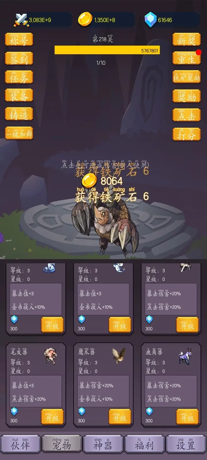 总之这游戏太简单,看广告进度稍微快一点,宠物不看广告以后养不动(目前神器没有属性强化,重生对强度可以说没有提升,所以卡宠物意味着目前你就卡着吧)