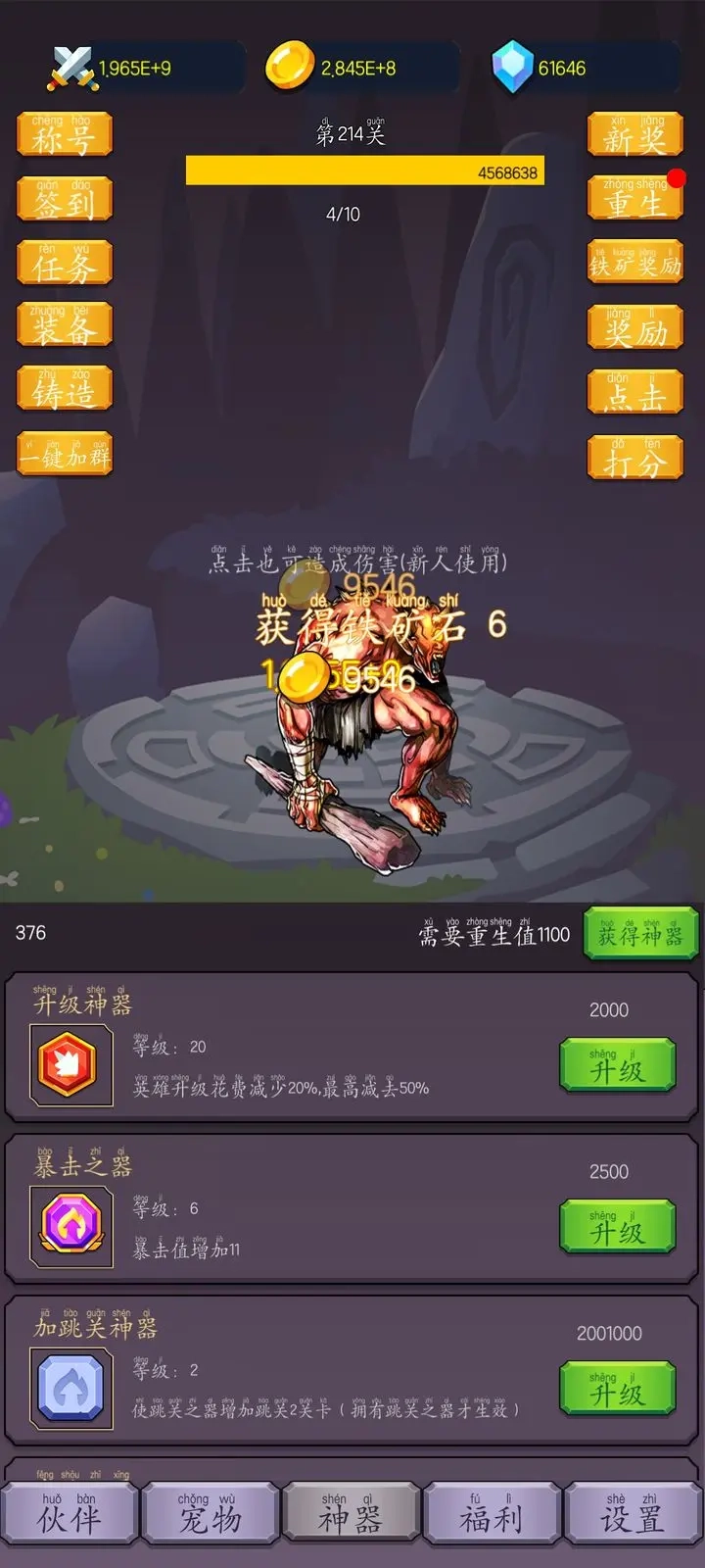 3.神器目前就5个,再买神器会使最便宜的神器升一级,所以优先所有神器都点超过1100(点击速度目前来说最有用)